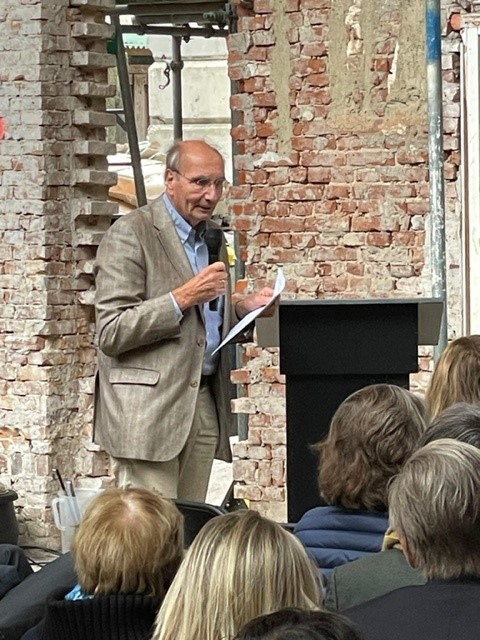 Mirjam del Canho heette de leden welkom op de bouwplaats. Na een korte presentatie over warmtepompen door de heer Wouter van Rossum van Viac, onze installateur, nam ons lid de heer Huib van Eesteren het woord. De heer van Eesteren gaf een bondige samenvatting van het Duurzaamheidsrapport over hofjes in Nederland. Het rapport, opgesteld door adviesbureau De Groene Grachten uit Amsterdam in opdracht van het Ministerie van Welzijn Volksgezondheid en Cultuur, gaat uitgebreid en diepgaand in op alle aspecten van verduurzaming van de hofjes.
